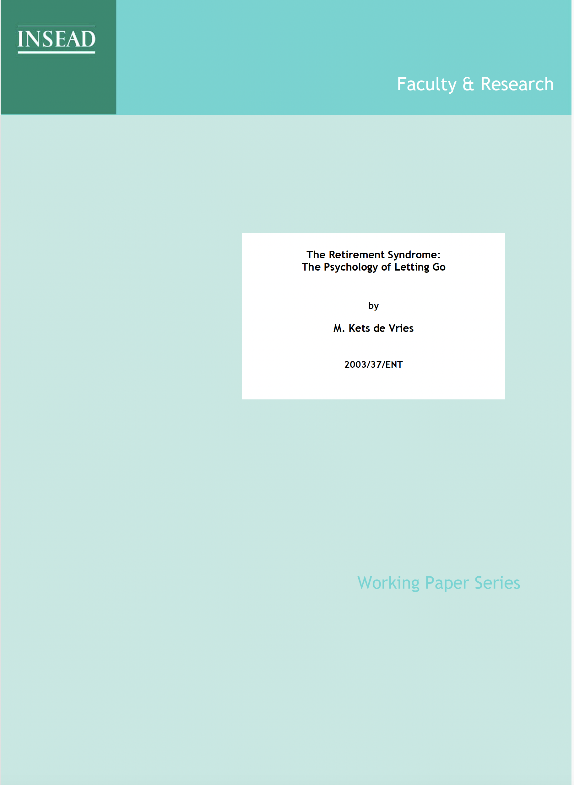 A landmark paper from INSEAD that names and examines what many executives feel but few discuss. Kets de Vries explores the emotional and psychological barriers to leaving — fear of losing identity, status, and relevance — and what it takes to disengage with dignity. One of the most cited articles on the inner life of retirement.