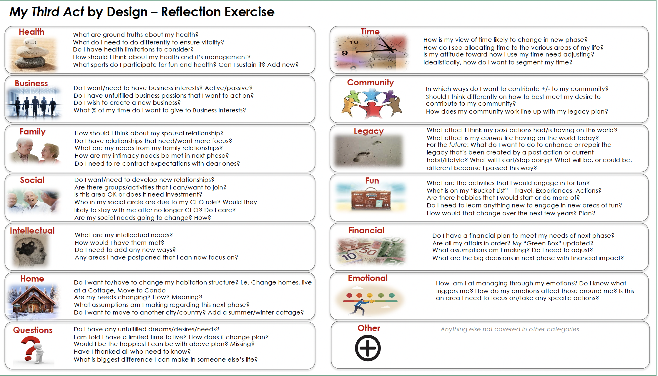 A reflection exercise to reflect on all the areas of our lives and how they may need to be adjusted as we enter the Third Act.